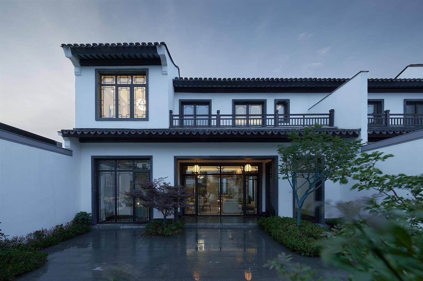 东方美学的“气韵”是缥缈且难以物化的,因此设计继承并优化了传统山院的形制,将借景、对景等传统造园手法融入项目的中式合院区,通过漏窗、月洞门、门廊等使被分隔的空间发生渗透,以形成分而不隔、穷而不尽的视觉体验。鸟瞰整个园区,如同一幅疏密相间、张弛有度的水墨丹青,缱绻地将环境纳入麾下,赋予场地轻盈的流动感与鲜活的生命力。